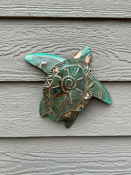 Sea Turtle copper garden art sculpture by artist Catherine Murphy of Haw Creek Forge. Comes with loop under sculpture for easy hang.