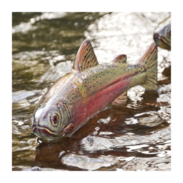 Ceramic Rainbow Trout outdoor decor, individually handcrafted and painted by Artists JJ Potts, with no two pieces alike.
